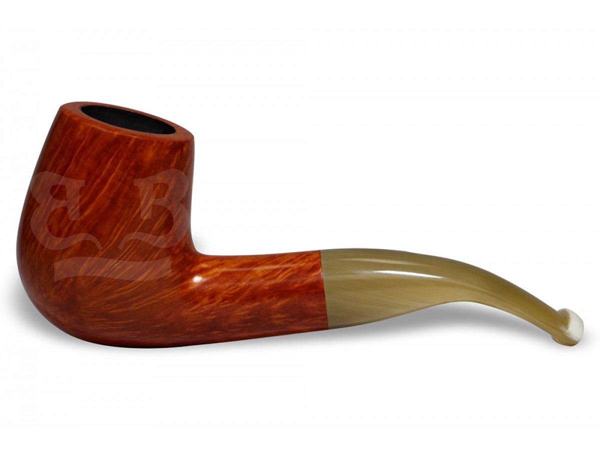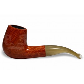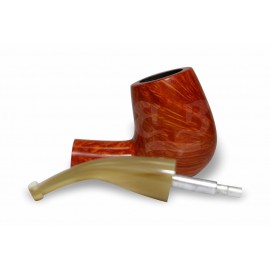 A piteira em chifre natural proporciona conforto superior, leveza e encaixe suave aos lábios, além de agregar exclusividade e identidade à peça. O acabamento encerado e posteriormente polido ressalta o desenho orgânico do briar e assegura proteção adequada, mantendo o caráter artesanal do cachimbo.