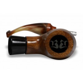 A piteira em chifre natural mesclado acrescenta personalidade imediata ao conjunto. Seus tons claros e escuros formam uma transição orgânica e elegante com o corpo do cachimbo, criando uma estética viva, sofisticada e impossível de passar despercebida. O anel de madeira complementa essa composição com harmonia e continuidade visual, reforçando o caráter artesanal da peça.