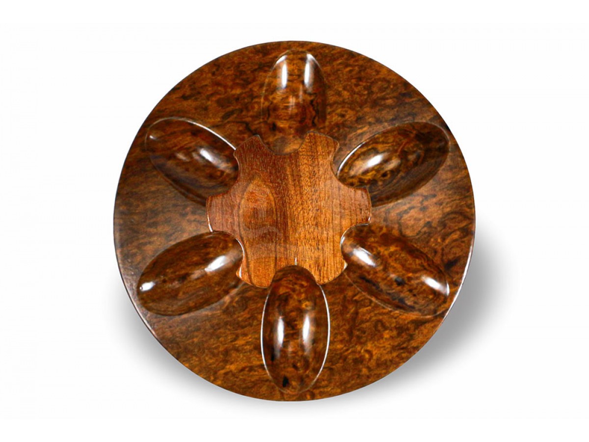 Seu formato redondo, cuidadosamente balanceado, garante estabilidade, excelente acomodação e visual sofisticado, destacando os cachimbos de forma elegante e harmoniosa. Cada encaixe foi esculpido para apoiar as peças com segurança, preservando acabamento e integridade.